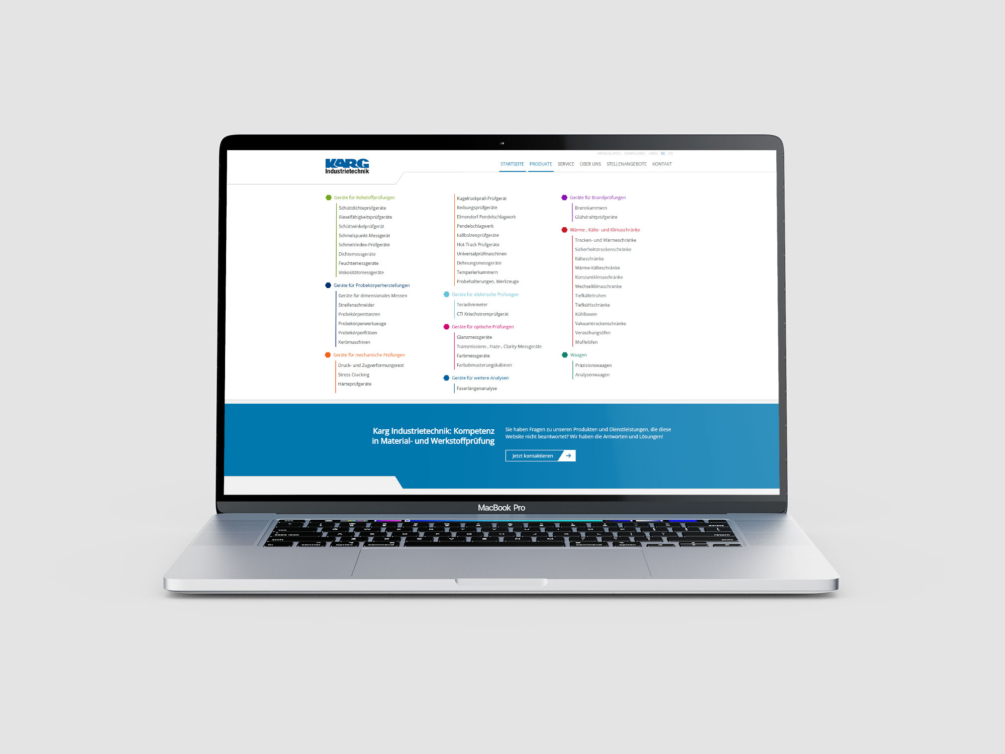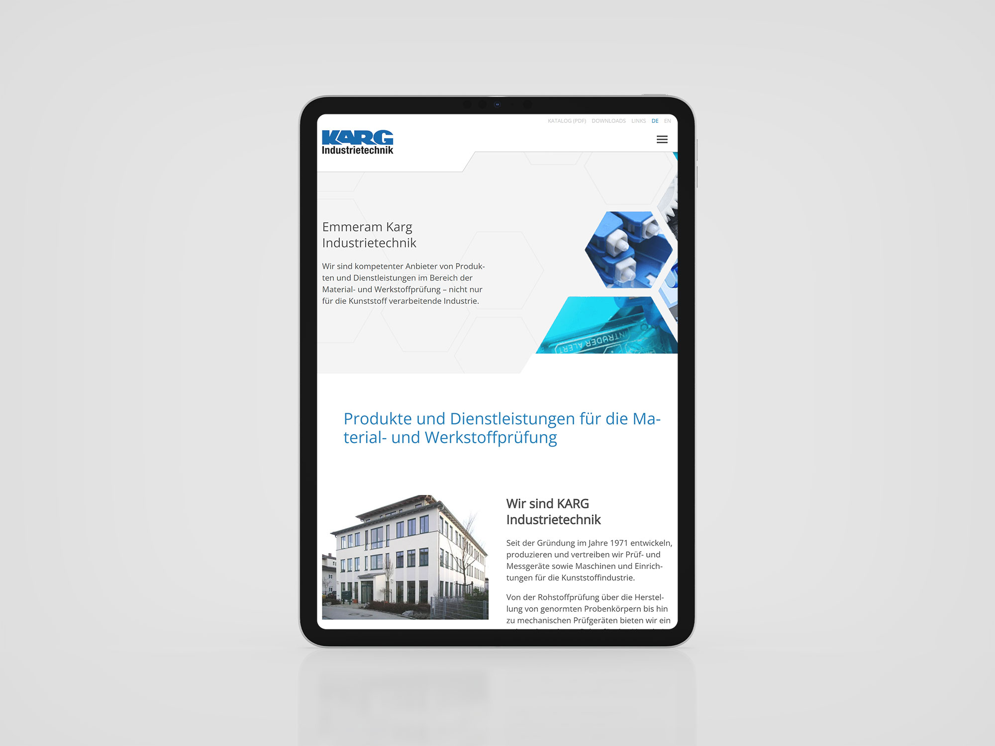 Für Karg Industrietechnik entstand ein Website-Relaunch, bei dem ich zentrale Designelemente wie die schräge Kopfzeile und die Waben-Teaser gestaltet und umgesetzt habe. Die mehrsprachige Website verfügt über ein Megamenü, bei dem jede Kategorie unterschiedliche Farben hat, die sich konsequent in Überschriften und Linkfarben auf den jeweiligen Unterseiten widerspiegeln