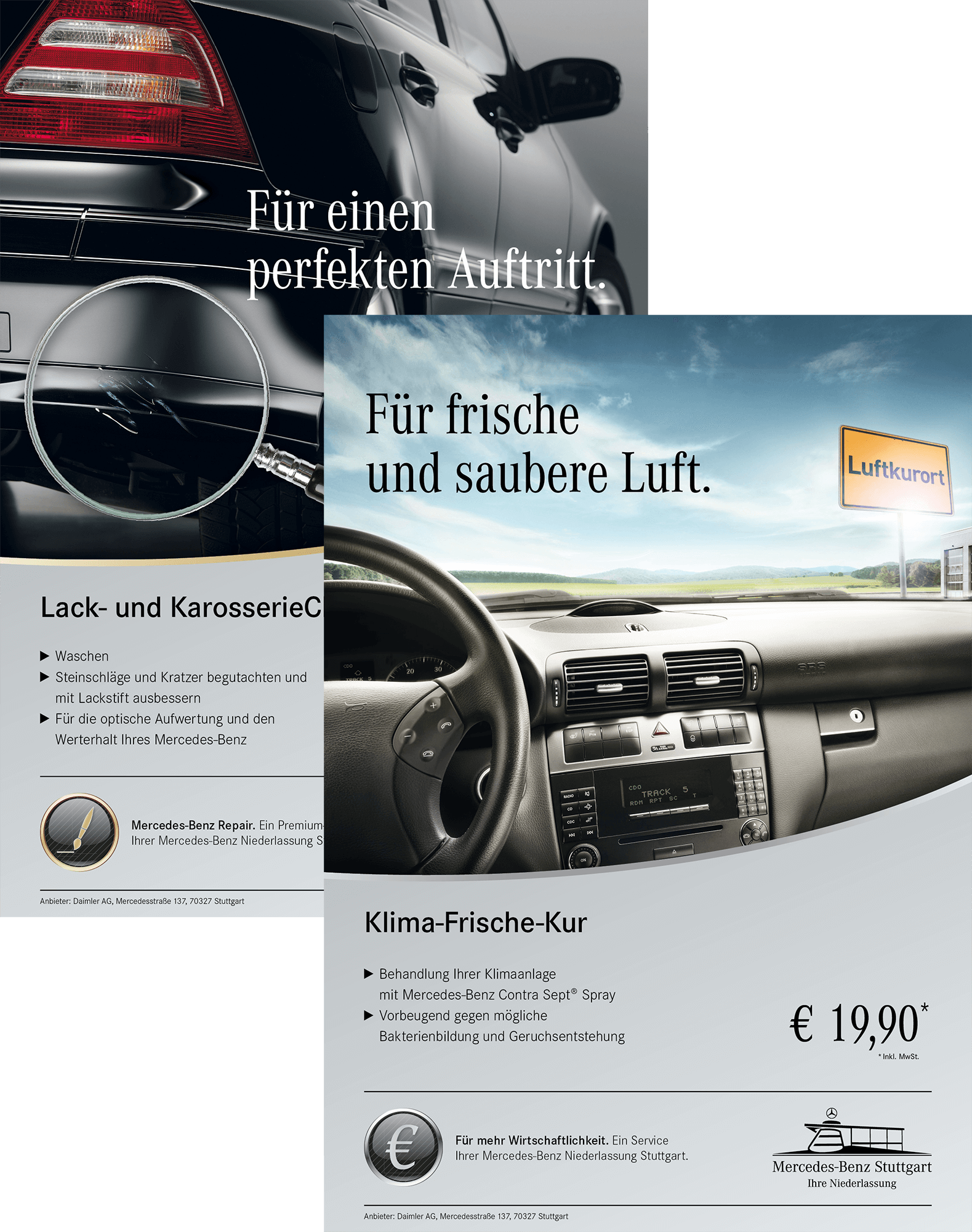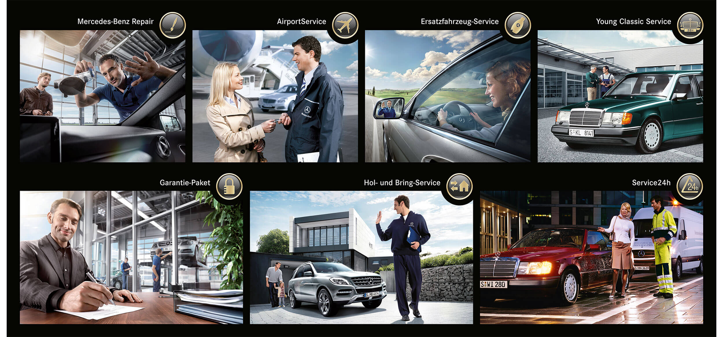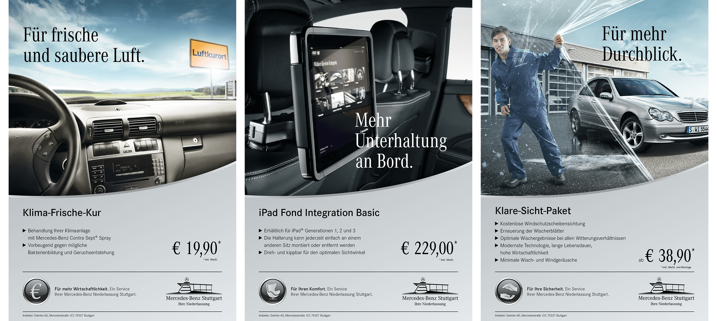 Für die Mercedes-Benz Niederlassung Stuttgart entwickelte ich zwölf Themen-Icons, die zentrale Serviceangebote wie Repair-, Hol- und Bring- oder Airport-Service visuell kennzeichnen. Die Icons wurden auf Plakaten und POS-Materialien umgesetzt und schaffen durch klare Formen und reduzierte Gestaltung eine einheitliche Bildsprache im Markenauftritt.