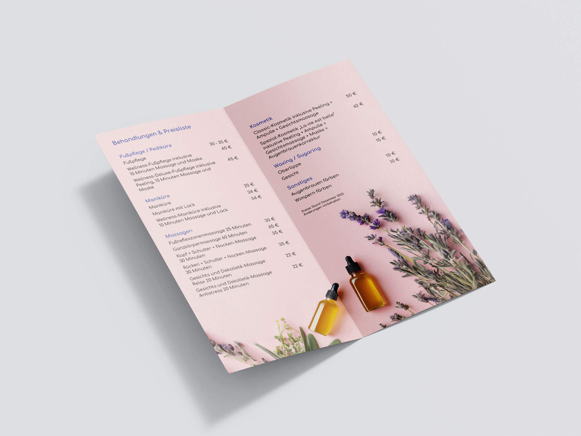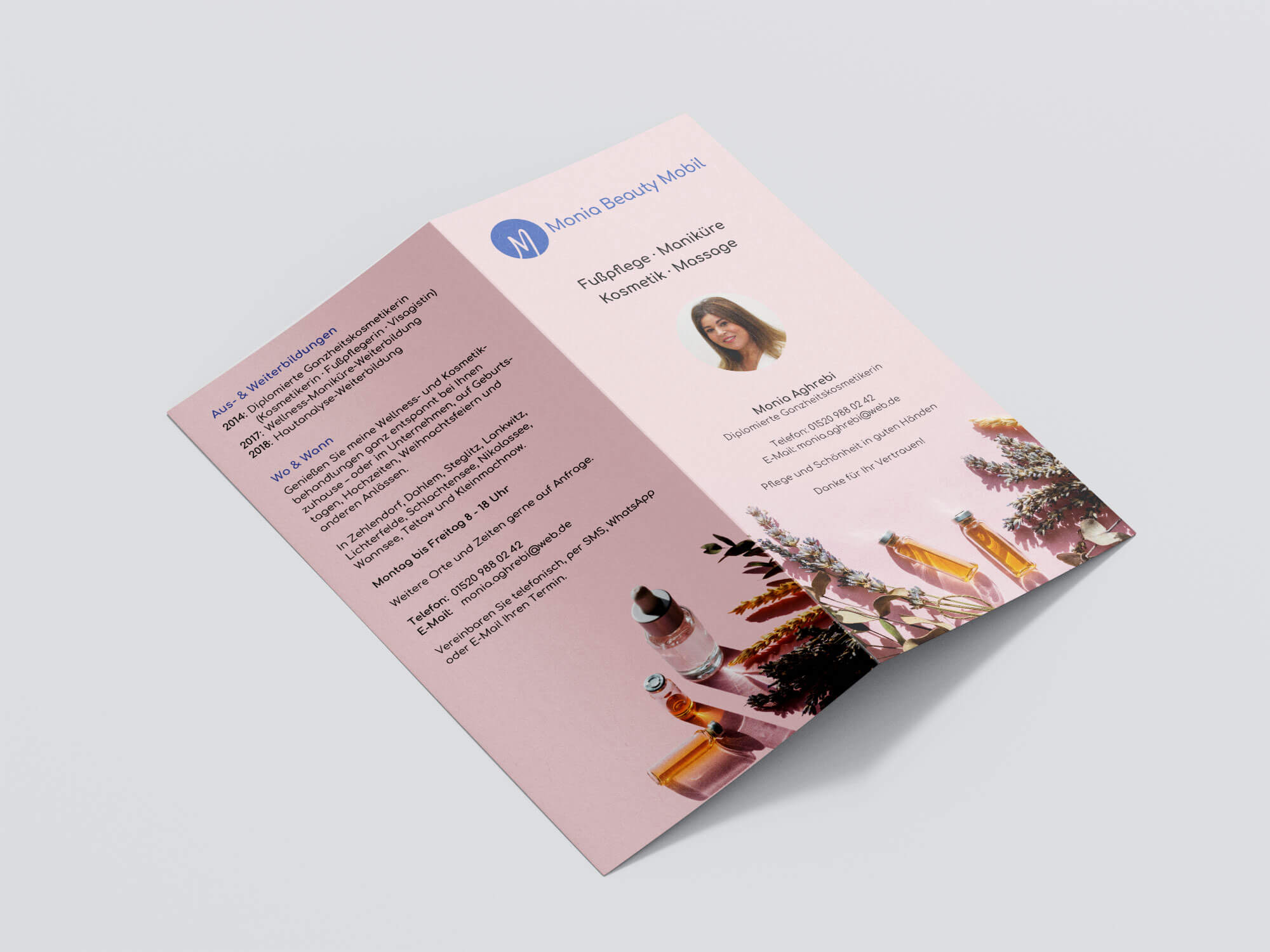 Für ein mobiles Kosmetikstudio entstand ein kompakter Flyer, der Leistungen, Preise und Kontaktdaten übersichtlich darstellt. Das Layout vermittelt eine klare, gepflegte Ästhetik und spiegelt den professionellen Anspruch der Kosmetikerin wider.