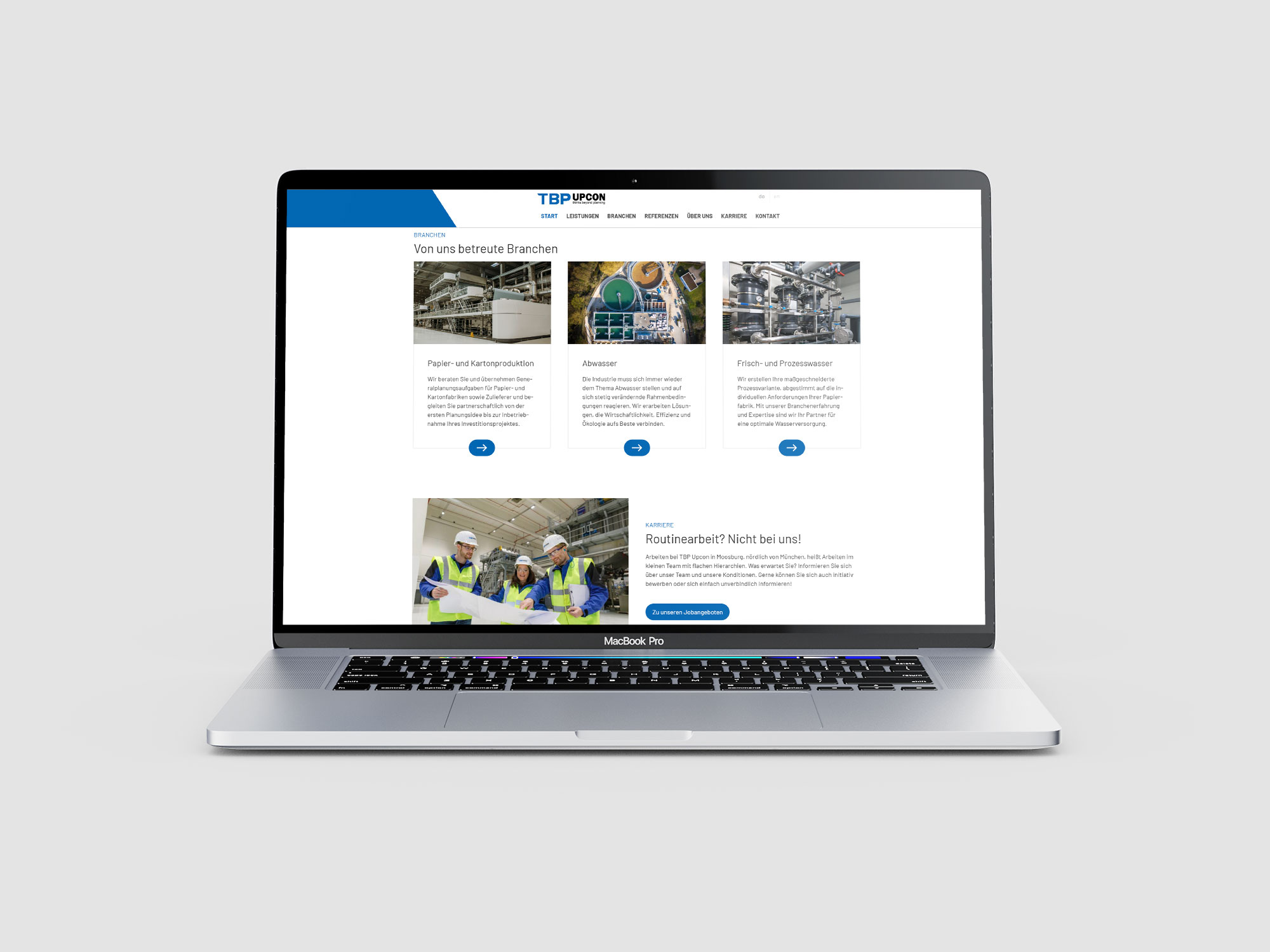 Für TBP Upcon habe ich die Website neu gestaltet und umgesetzt. Das Design unterstützt die Präsentation der komplexen Leistungen in Verfahrenstechnik, Abwassertechnik und Wasseraufbereitung und sorgt für eine klare, übersichtliche Struktur. Die Website wurde mit WebEdition aufgesetzt, sodass der Kunde Inhalte eigenständig pflegen kann.